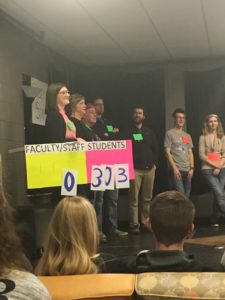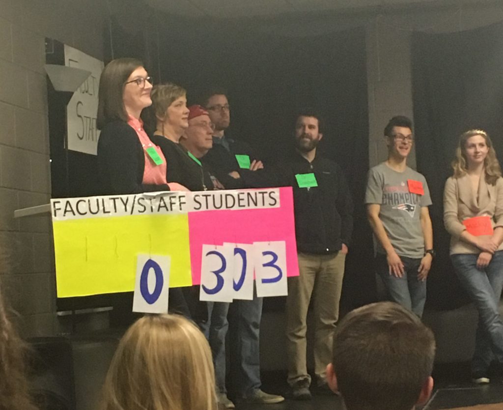 An audience full of laughter and excitement filled SUB 7 Friday night when Milligan College enjoyed its annual Faculty Feud. Sponsored by Milligan’s Alpha Chi, the spin-off on the television game show “Family Feud” included a team of faculty versus a team of students competing to answer questions about topics relevant on campus.