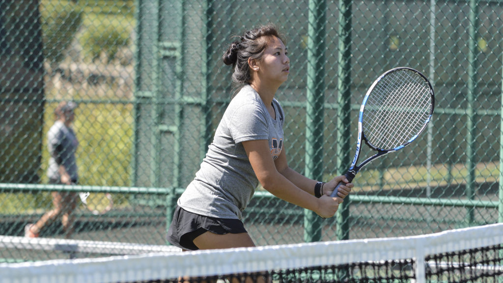 Minda Martin plays at the net. Photo via milliganbuffs.com