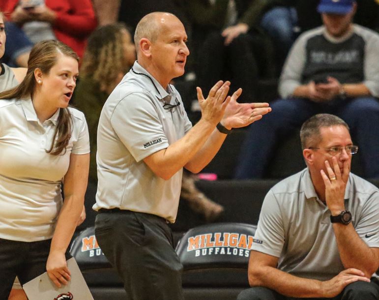 Headline photo: Milligan women’s basketball head coach, Rich Aubrey, on the sideline at a game. Photo from the Milligan women’s basketball Twitter account, @MilliganWBB.