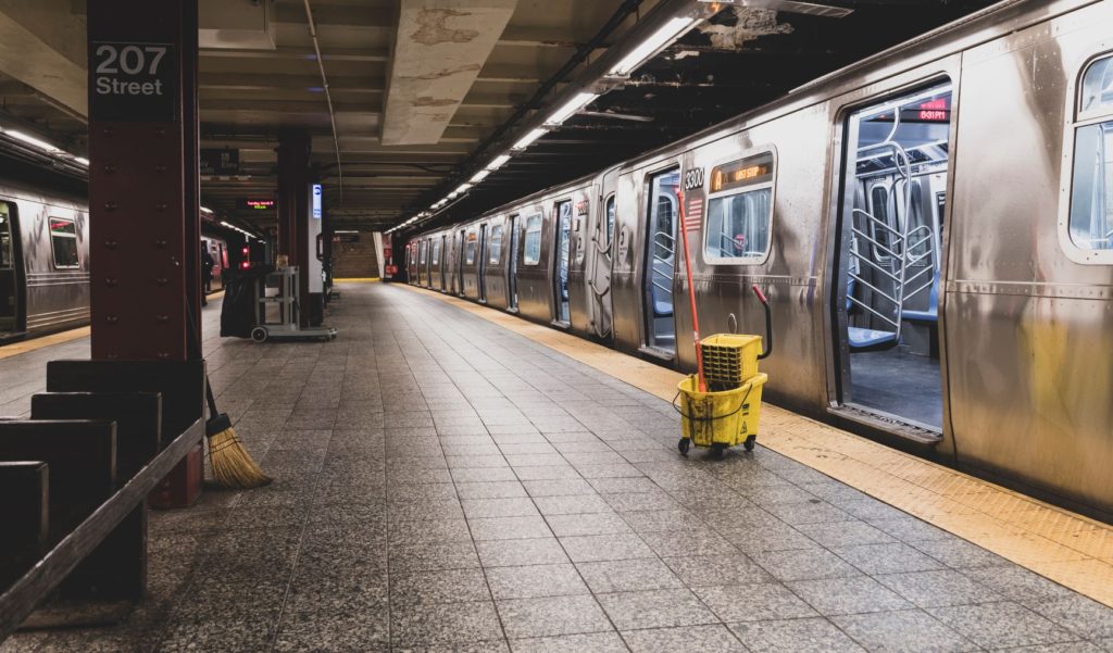Headline photo: At the end of the A train line at Inwood – 207th Street Station in Manhattan, a mop and bucket stand outside the open door of a subway car ready to be cleaned.