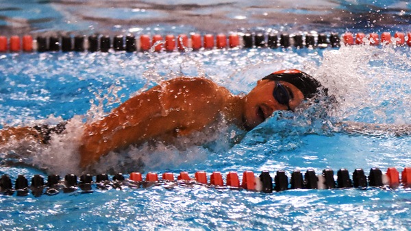 Caption: Freshman Andre Bazzana leading the 200m free, which he won and posted a national qualifying time of 1:43.92