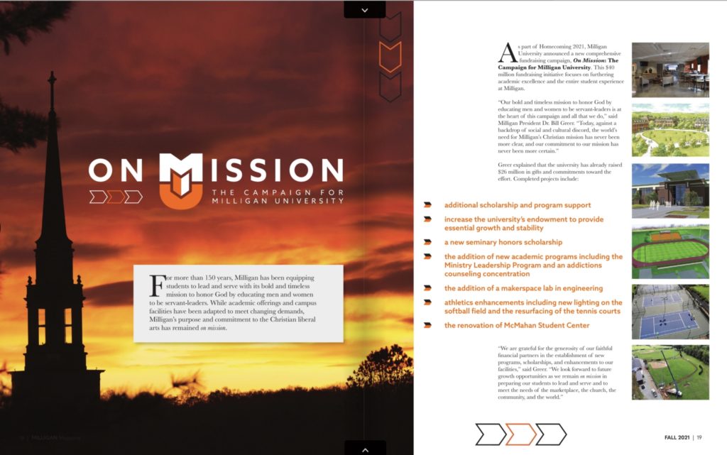 With changes coming to academics and student life, Milligan has been pushing efforts to support these developments financially. The university announced its new fundraising campaign, On Mission: The Campaign for Milligan University, on Oct. 28, 2021, as part of these efforts.