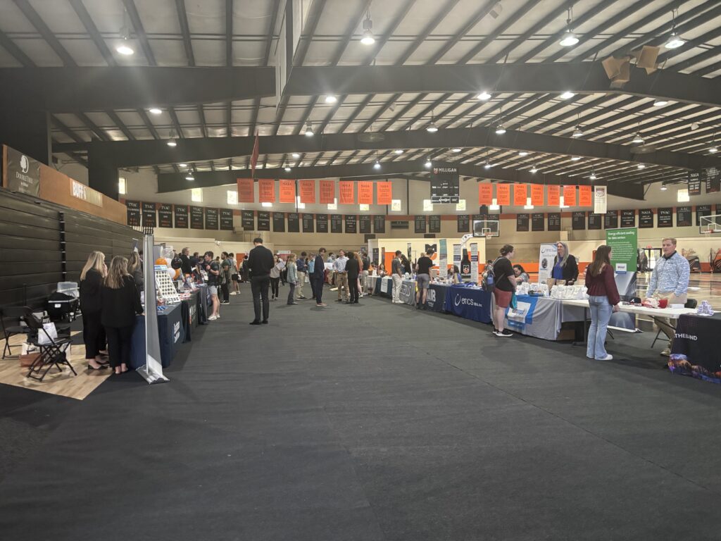 Milligan hosted a career fair on Tuesday, Sept. 23, in the Lacy Fieldhouse. The event, organized by Beth Anderson, featured 24 businesses ranging from finance and engineering to construction and the Bristol Motor Speedway. The fair allowed students to explore potential career paths, meet employers, inquire about internships, and practice networking skills. Attendees also had the chance to ask questions about different industries and gather resources for future job searches.