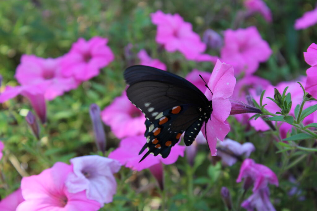 Cover Photo: Butterfly hovering around royal magenta petunia flowers right outside of Sutton Hall (photo credit: Danielle Roberts)